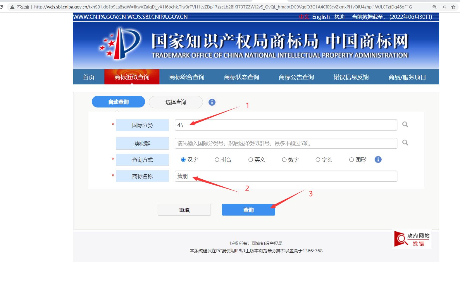 第四步,点“商标近似查询”,输入类别“45”号,商标名称填写“策朋”,点“查询”