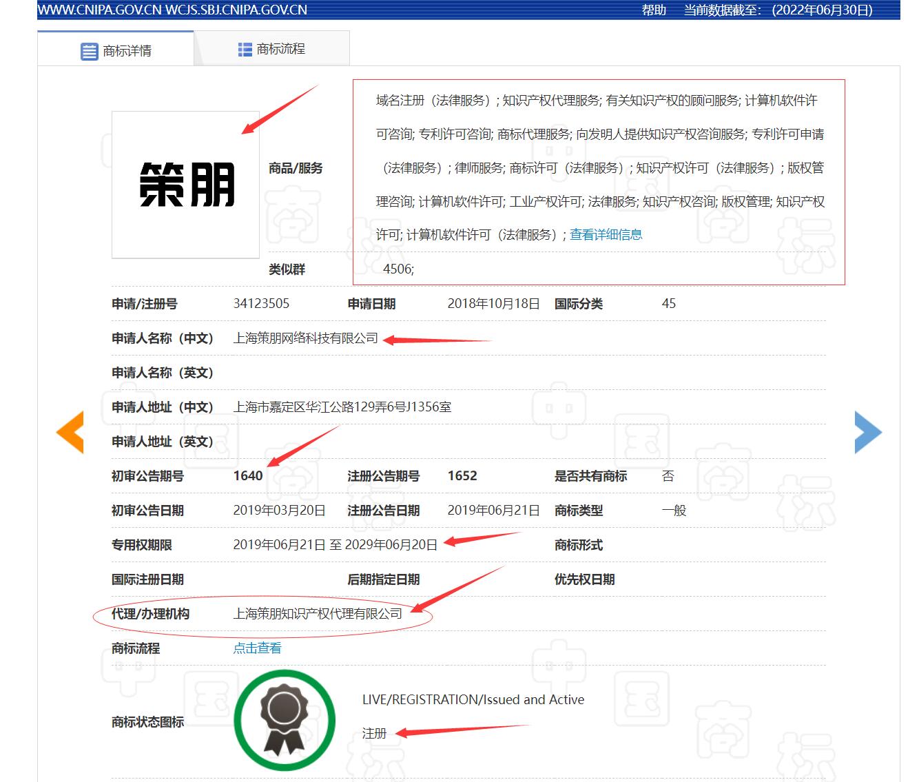 第八步,如果您还想查询“策朋”商标的商标流程,点开“商标流程”,会显示这个商标的每个环节流程,非常一目了然,能知道该商标经历了什么事,如果有任何问题,这个“商标流程”都会被记录备案。
